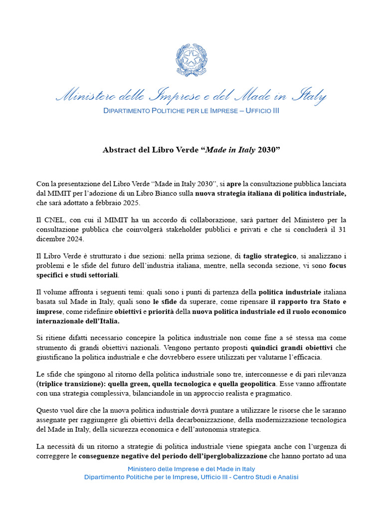 dal MIMIT per l’adozione di un Libro Bianco sulla nuova strategia italiana di politica industriale,