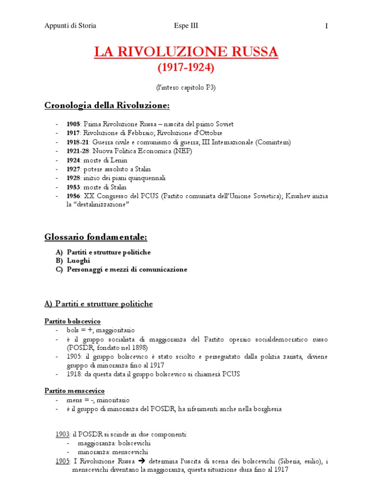 1905: Prima Rivoluzione Russa nascita del primo Soviet 1917: Rivoluzione di Febbraio; Rivoluzione dOttobre 1918-21: Guerra civile e comunismo di guerra; III Internazionale (Comintern) 1921-28: Nuova Politica Economica (NEP) 1924: morte di Lenin 1927: potere assoluto a Stalin 1928: inizio dei piani quinquennali 1953: morte di Stalin 1956: XX Congresso del PCUS (Partito comunista dellUnione Sovietica); Krushev inizia la destalinizzazione