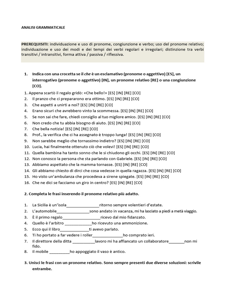PREREQUISITI: individuazione e uso di pronome, congiunzione e verbo; uso del pronome relativo;