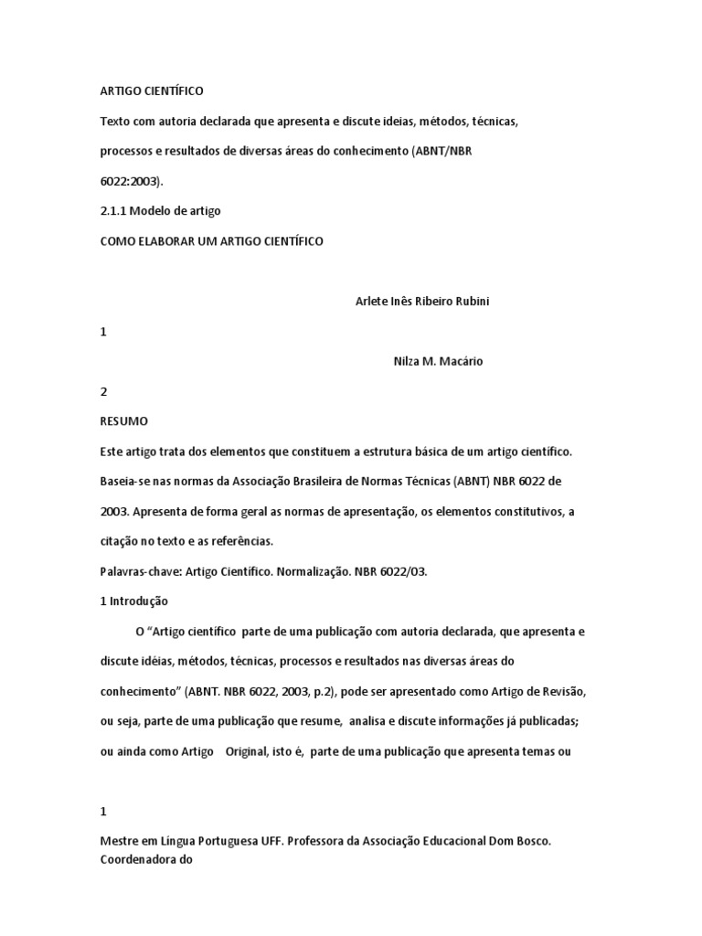 Arlete Ins Ribeiro Rubini 1 Nilza M. Macrio 2 RESUMO Este artigo trata dos elementos que constituem a estrutura bsica de um artigo cientfico. Baseia-se nas normas da Associao Brasileira de Normas Tcnicas (ABNT) NBR 6022 de 2003. Apresenta de forma geral as normas de apresentao, os elementos constitutivos, a citao no texto e as referncias. Palavras-chave: Artigo Cientfico. Normalizao. NBR 6022/03. 1 Introduo O Artigo cientfico parte de uma publicao com autoria declarada, que apresenta e discute idias, mtodos, tcnicas, processos e resultados nas diversas reas do conhecimento (ABNT. NBR 6022, 2003, p.2), pode ser apresentado como Artigo de Reviso, ou seja, parte de uma publicao que resume, analisa e discute informaes j publicadas; ou ainda como Artigo Original, isto , parte de uma publicao que apresenta temas ou