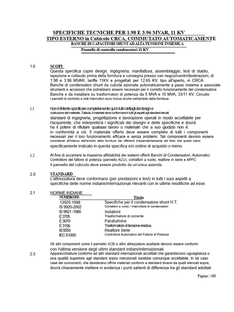 1.98 e 3.96 MVAR, tariffe 11KV e progettati per 12.65 KV, tipo all'aperto, in CRCA