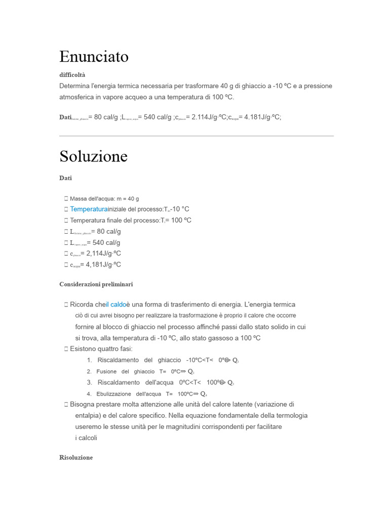 Determina l'energia termica necessaria per trasformare 40 g di ghiaccio a -10 ºC e a pressione