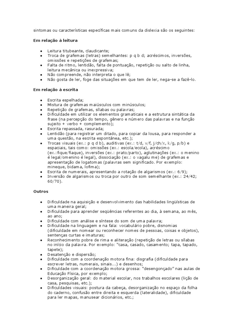 Outros Dificuldade na aquisio e desenvolvimento das habilidades lingsticas de uma maneira geral; Dificuldade para aprender seqncias referentes ao dia, semana, ao ms, ao ano; Dificuldade com anlise e sntese do som de uma palavra; Dificuldade na linguagem e na fala: vocabulrio pobre, disnomias (dificuldade em nomear ou reconhecer nomes de pessoas, coisas e objetos), sentenas curtas e imaturas; Reconhecimento pobre de rima e aliterao (repetio de letras ou slabas no incio da palavra. Por exemplo: casa, casado, casamento; tapa, tapado, tapete); Desateno e disperso; Dificuldade com a coordenao motora fina: disgrafia (dificuldade para escrever letras, numerais, sinais...) e desenhos; Dificuldade com a coordenao motora grossa: desengonado nas aulas de Educao Fsica, por exemplo; Desorganizao geral: do material escolar, nos trabalhos escolares (lio de casa, pesquisas, etc.); Dificuldades visuais: postura da cabea, desorganizao no espao da folha do caderno, confuso entre direita e esquerda (lateralidade), dificuldade para ler mapas, manusear dicionrios, etc.;