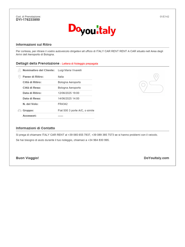 Dettagli della Prenotazione Lettera di Noleggio prepagata