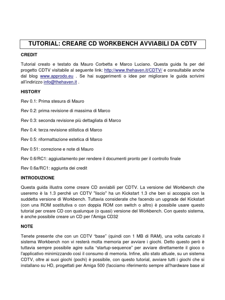 CREDIT Tutorial creato e testato da Mauro Corbetta e Marco Luciano. Questa guida fa per del progetto CDTV visitabile al seguente link: [Link] e consultabile anche dal blog [Link] . Se hai suggerimenti o idee per migliorare le guida scrivimi allindirizzo info@[Link] . HISTORY Rev 0.1: Prima stesura di Mauro Rev 0.2: prima revisione di massima di Marco Rev 0.3: seconda revisione pi dettagliata di Marco Rev 0.4: terza revisione stilistica di Marco Rev 0.5: riformattazione estetica di Marco Rev 0.51: correzione e note di Mauro Rev 0.6/RC1: aggiustamento per rendere il documenti pronto per il controllo finale Rev 0.6a/RC1: aggiunta dei credit INTRODUZIONE Questa guida illustra come creare CD avviabili per CDTV. La versione del Workbench che useremo la 1.3 perch un CDTV "liscio" ha un Kickstart 1.3 che ben si accoppia con la suddetta versione di Workbench. Tuttavia considerate che facendo un upgrade del Kickstart (con una ROM sostitutiva o con doppia ROM con switch o altro) possibile usare questo tutorial per creare CD con qualunque (o quasi) versione del Workbench. Con questo sistema, anche possibile creare un CD per l'Amiga CD32 NOTE Tenete presente che con un CDTV base (quindi con 1 MB di RAM), una volta caricato il sistema Workbench non vi rester molta memoria per avviare i giochi. Detto questo per tuttavia sempre possibile agire sulla startup-sequence per avviare direttamente il gioco o l'applicativo minimizzando cos il consumo di memoria. Infine, allo stato attuale, su un sistema CDTV, oltre ai suoi giochi (pochi) possibile, con questo tutorial, avviare tutti i giochi che si installano su HD, progettati per Amiga 500 (facciamo riferimento sempre all'hardware base al