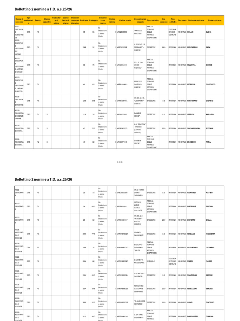 graduatori Fascia ia di fascia di concorso Posizione Punteggio e con Codice scuola Tipo contratto Tipo posto Cognome aspirante Nome aspirante