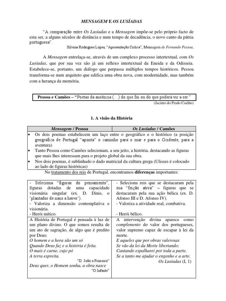1. A viso da Histria Mensagem / Pessoa Os Lusadas / Cames Os dois poemas estabelecem um lao entre o geogrfico e o histrico (a posio geogrfica de Portugal aponta o caminho para o mar e para o Ocidente, para a aventura) Tanto Pessoa como Cames selecionam, a seu jeito, a histria, destacando as figuras que mais lhes interessam para o projeto global da sua obra. Nos dois poemas, sublinhado o dado matricial da cultura grega (Ulisses colocado ao lado de figuras histricas) No tratamento dos reis de Portugal, encontramos diferenas importantes: - Seleciona reis que se destacaram pela sua feio ativa figuras que se destacaram pela sua ao blica (ex. D. Afonso III e D. Afonso IV). - Valoriza a atividade real, combativa. - Heri blico. A interveno divina aparece como complemento do valor dos portugueses, valor supremo capaz de escapar lei da morte. E aqueles que por obras valerosas Se vo da lei da Morte libertando; Cantando espalharei por toda a parte, Se a tanto me ajudar o engenho e a arte. Os Lusadas (I, 1)