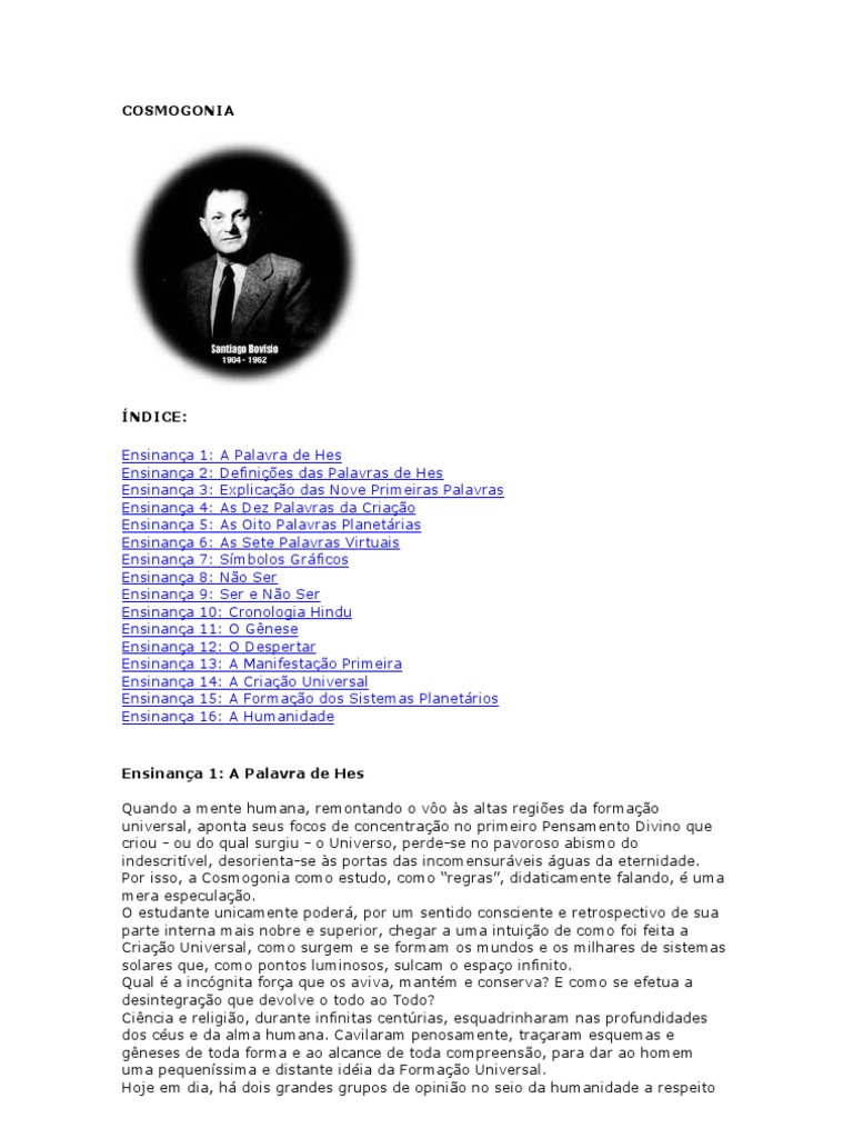 Ensinana 1: A Palavra de Hes Quando a mente humana, remontando o vo s altas regies da formao universal, aponta seus focos de concentrao no primeiro Pensamento Divino que criou - ou do qual surgiu - o Universo, perde-se no pavoroso abismo do indescritvel, desorienta-se s portas das incomensurveis guas da eternidade. Por isso, a Cosmogonia como estudo, como regras, didaticamente falando, uma mera especulao. O estudante unicamente poder, por um sentido consciente e retrospectivo de sua parte interna mais nobre e superior, chegar a uma intuio de como foi feita a Criao Universal, como surgem e se formam os mundos e os milhares de sistemas solares que, como pontos luminosos, sulcam o espao infinito. Qual a incgnita fora que os aviva, mantm e conserva? E como se efetua a desintegrao que devolve o todo ao Todo? Cincia e religio, durante infinitas centrias, esquadrinharam nas profundidades dos cus e da alma humana. Cavilaram penosamente, traaram esquemas e gneses de toda forma e ao alcance de toda compreenso, para dar ao homem uma pequenssima e distante idia da Formao Universal. Hoje em dia, h dois grandes grupos de opinio no seio da humanidade a respeito