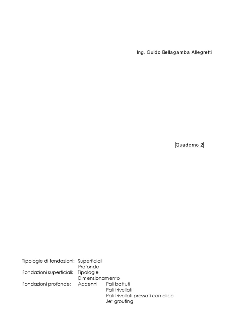 La fondazione quella parte della struttura alla quale viene affidato il compito di trasferire i carichi al terreno, nel rispetto dei requisiti di progetto. Le fondazioni possono essere dirette o superficiali oppure profonde a seconda della natura del terreno su cui insiste la struttura e della tipologia della sovrastruttura 1.1 Fondazioni superficiali o dirette Applicano una pressione subverticale al terreno su unarea di impronta allargata rispetto agli elementi portanti della sovrastruttura. La necessit di avere alla base del plinto unarea maggiore di quella dei relativi pilastri e/o setti portanti, legata al fatto che il terreno presenta rigidezza e resistenza inferiori rispetto agli elementi strutturali. A parit di carichi, quindi le tensioni trasmesse tramite tale maggiorazione, permette la riduzione delle tensioni trasmesse, rendendole confrontabili coi valori del terreno di imposta. Il piano di posa deve essere posizionato ad una profondit tale da: oltrepassare la coltre superficiale detritica; oltrepassare lo strato soggetto a gelo-disgelo; essere al di fuori o totalmente entro la fascia di oscillazione della falda; rispettare i vincoli geometrici relativi alla posizione del piano di posa delle fondazioni vicine ( comunque consigliabile impostare tutte le fondazioni di uno stesso edificio alla medesima quota). La profondit D del piano di posa da p.c. influenza sia la capacit portante che lentit dei cedimenti, infatti al suo crescere, a parit di carichi, decrescono i cedimenti ed aumenta la capacit portante. Le problematiche esecutive legate alla realizzazione di fondazioni dirette sono: dov presente la falda freatica necessario abbassarla temporaneamente con un emungimento controllato dellarea o con barriere di flusso evitando cedimenti negli edifici attigui (per variazioni di falda);