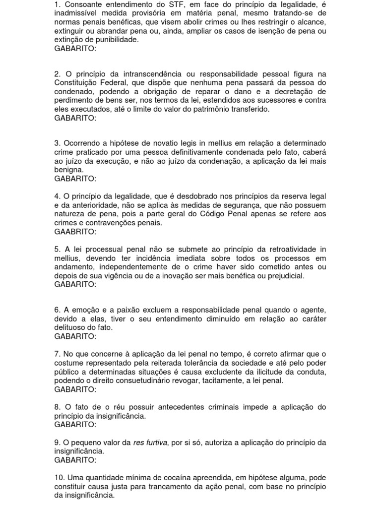 Consoante entendimento do STF, em face do princpio da legalidade, inadmissvel medida provisria em matria penal, mesmo tratando-se de normas penais benficas, que visem abolir crimes ou lhes restringir o alcance, extinguir ou abrandar pena ou, ainda, ampliar os casos de iseno de pena ou extino de punibilidade. GABARITO: 2. O princpio da intranscendncia ou responsabilidade pessoal figura na Constituio Federal, que dispe que nenhuma pena passar da pessoa do condenado, podendo a obrigao de reparar o dano e a decretao de perdimento de bens ser, nos termos da lei, estendidos aos sucessores e contra eles executados, at o limite do valor do patrimnio transferido. GABARITO: 3. Ocorrendo a hiptese de novatio legis in mellius em relao a determinado crime praticado por uma pessoa definitivamente condenada pelo fato, caber ao juzo da execuo, e no ao juzo da condenao, a aplicao da lei mais benigna. GABARITO: 4. O princpio da legalidade, que desdobrado nos princpios da reserva legal e da anterioridade, no se aplica s medidas de segurana, que no possuem natureza de pena, pois a parte geral do Cdigo Penal apenas se refere aos crimes e contravenes penais. GAABRITO: 5. A lei processual penal no se submete ao princpio da retroatividade in mellius, devendo ter incidncia imediata sobre todos os processos em andamento, independentemente de o crime haver sido cometido antes ou depois de sua vigncia ou de a inovao ser mais benfica ou prejudicial. GABARITO: 6. A emoo e a paixo excluem a responsabilidade penal quando o agente, devido a elas, tiver o seu entendimento diminudo em relao ao carter delituoso do fato. GABARITO: 7. No que concerne aplicao da lei penal no tempo, correto afirmar que o costume representado pela reiterada tolerncia da sociedade e at pelo poder pblico a determinadas situaes causa excludente da ilicitude da conduta, podendo o direito consuetudinrio revogar, tacitamente, a lei penal. GABARITO: 8. O fato de o ru possuir antecedentes criminais impede a aplicao do princpio da insignificncia. GABARITO: 9. O pequeno valor da res furtiva, por si s, autoriza a aplicao do princpio da insignificncia. GABARITO: 10. Uma quantidade mnima de cocana apreendida, em hiptese alguma, pode constituir causa justa para trancamento da ao penal, com base no princpio da insignificncia.