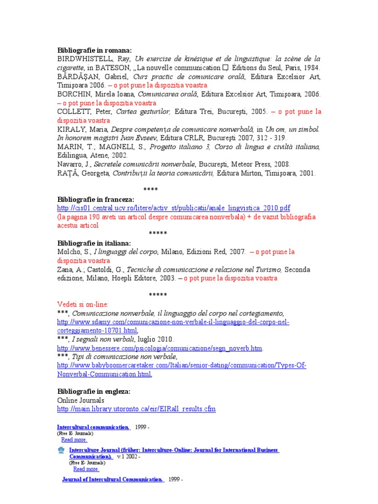 , 1984. , BRDAN, Gabriel, Curs practic de comunicare oral, Editura Excelsior Art, Timioara 2006. o pot pune la dispozitia voastra BORCHIN, Mirela Ioana, Comunicarea oral, Editura Excelsior Art, Timioara, 2006. o pot pune la dispozitia voastra COLLETT, Peter, Cartea gesturilor, Editura Trei, Bucureti, 2005. o pot pune la dispozitia voastra KIRALY, Maria, Despre competena de comunicare nonverbal, in Un om, un simbol. In honorem magistri Ivan Evseev, Editura CRLR, Bucureti 2007, 312 - 319. MARIN, T.; MAGNELI, S., Progetto italiano 3, Corso di lingua e civilt italiana, Edilingua, Atene, 2002. Navarro, J., Secretele comunicrii nonverbale, Bucureti, Meteor Press, 2008. RA, Georgeta, Contribuii la teoria comunicrii, Editura Mirton, Timioara, 2001. **** Bibliografie in franceza: [Link] (la pagina 190 aveti un articol despre comunicarea nonverbala) + de vazut bibliografia acestui articol ***** Bibliografie in italiana: Molcho, S., I linguaggi del corpo, Milano, Edizioni Red, 2007. o pot pune la dispozitia voastra Zana, A.; Castoldi, G., Tecniche di comunicazione e relazione nel Turismo, Seconda edizione, Milano, Hoepli Editore, 2003. o pot pune la dispozitia voastra ***** Vedeti si on-line: ***, Comunicazione nonverbale, il linguaggio del corpo nel cortegiamento, [Link] ***, I segnali non verbali, luglio 2010. [Link] ***, Tipi di comunicazione non verbale, [Link] Bibliografie in engleza: Online Journals [Link]