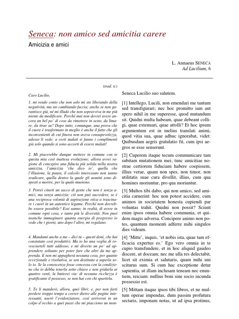 (trad. tc) Caro Lucilio, 1. mi rendo conto che non solo mi sto liberando della negativit, ma sto cambiando faccia; anche se non garantisco gi, n mi illudo che non sopravviva in me pi niente da modificare. Perch mai non dovrei avere ancora un bel po di cose da rimettere in sesto, da limare, da tirar su? Dopo tutto, comunque, una prova che il cuore trasformato in meglio anche il fatto che gli inconvenienti di cui finora non aveva consapevolezza, adesso li vede: a certi malati si fanno i complimenti gi solo quando si sono accorti di essere malati! 2. Mi piacerebbe dunque mettere in comune con te questa mia cos inattesa evoluzione; allora avrei ragione di concepire una fiducia pi solida nella nostra amicizia, lamicizia che dico io, quella che lillusione, la paura, il calcolo interessato non sanno sradicare, quella dentro la quale gli uomini sono disposti a morire, per la quale muoiono. 3. Potrei citarti un sacco di gente che non senza amici, ma senza amicizia: ci non pu succedere, se una reciproca volont di aspirazione etica a trascinare i cuori in un autentico legame. Perch non dovrebbe essere possibile? Essi sanno, in realt, di avere in comune ogni cosa, e tanto pi le diversit. Non puoi neanche immaginare quanta energia di progresso io vedo che i giorni, uno dopo laltro, mi regalano.