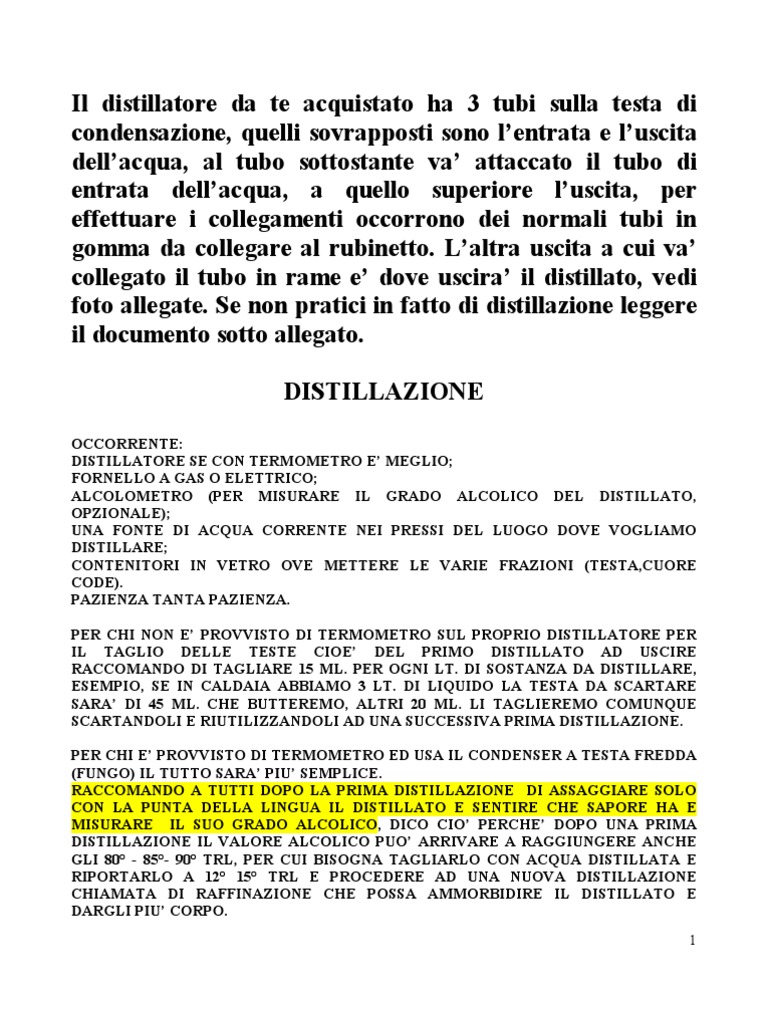 QUALORA IL DISTILLATORE SIA NUOVO MAI USATO VI CONSIGLEREI PRIMA DI METTERLO IN OPERA DI LAVARLO ACCURATAMENTE CON DELLA SEMPLICE ACQUA, NON USATE SOLVENTI O DETERSIVI, DOPODICHE PROCEDERE AD UNA PRIMA DISTILLAZIONE USANDO DELLA SEMPLICE ACQUA , O SE AVETE DEL VINO ANDATO A MALE, IL MIO CONSIGLIO E QUELLO DI TENERE LA FIAMMA IL PIU BASSA POSSIBILE, LO SO CI VUOLE PAZIENZA, SI RACCOMANDA DI ESEGUIRE LA DISTILLAZIONE SE ALLINTERNO IN UN LUOGO BEN AEREGGIATO. SOTTO VI E UNA DESCRIZIONE PIU DETTAGLIATA SULLA DISTILLAZIONE E SU COME AVVIENE TALE PROCESSO, VI PREGHEREI DI LEGGERLA ATTENTAMENTE. SALUTI A TUTTI.