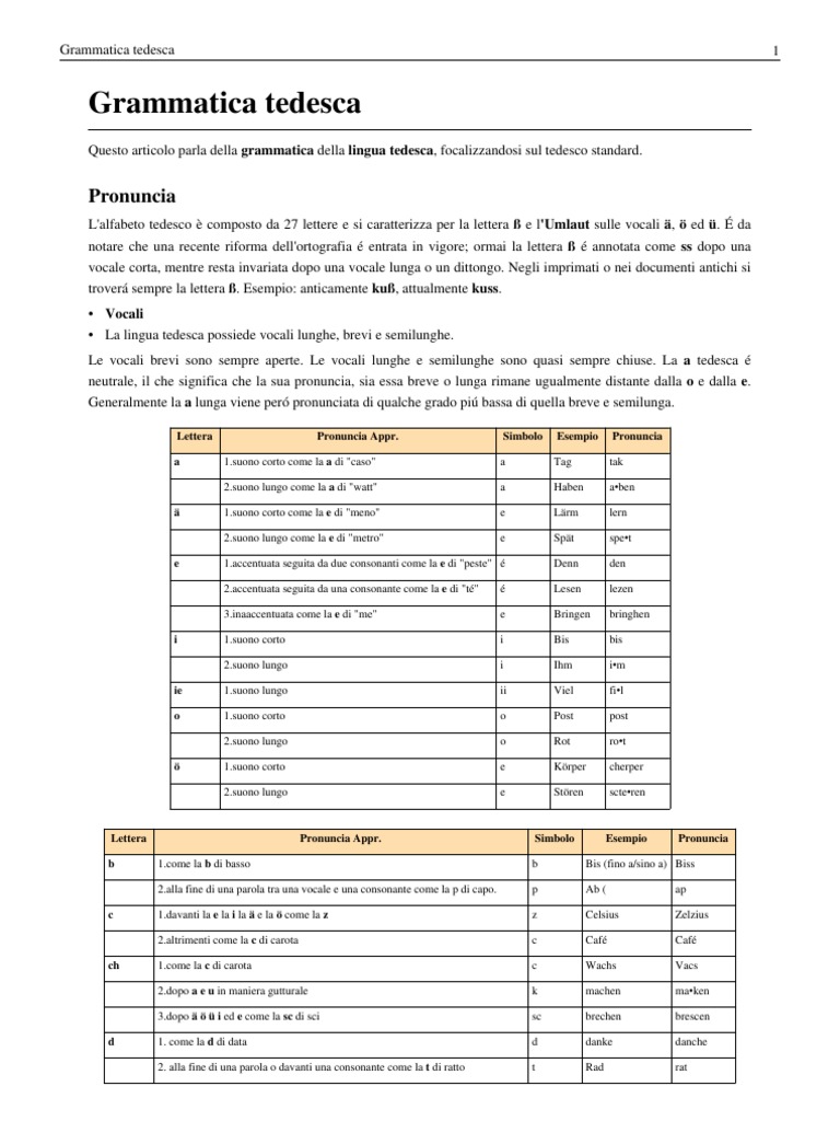 L'alfabeto tedesco composto da 27 lettere e si caratterizza per la lettera e l'Umlaut sulle vocali , ed . da notare che una recente riforma dell'ortografia entrata in vigore; ormai la lettera annotata come ss dopo una vocale corta, mentre resta invariata dopo una vocale lunga o un dittongo. Negli imprimati o nei documenti antichi si trover sempre la lettera . Esempio: anticamente ku, attualmente kuss. Vocali La lingua tedesca possiede vocali lunghe, brevi e semilunghe. Le vocali brevi sono sempre aperte. Le vocali lunghe e semilunghe sono quasi sempre chiuse. La a tedesca neutrale, il che significa che la sua pronuncia, sia essa breve o lunga rimane ugualmente distante dalla o e dalla e. Generalmente la a lunga viene per pronunciata di qualche grado pi bassa di quella breve e semilunga.