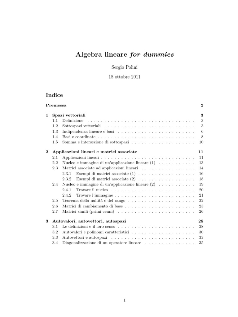 Qualche tempo fa ho sostenuto un esame di algebra lineare e, mentre mi preparavo, seguivo il forum di [Link]. Mi stupiva vedere come tanti che ponevano domande avessero idee maledettamente confuse. Forse in alcuni corsi di laurea si chiede solo una infarinatura di algebra lineare e le inevitabili semplicazioni rendono in realt ancora pi dicile la comprensione dei vari argomenti. Forse anche dicile chiarire un dubbio sfogliando un testo diverso dal proprio, perch i testi di algebra lineare seguono ciascuno una propria impostazione, anche con dierenze molto marcate (ci sono perno titoli chiaramente contrapposti come Linear algebra done rigt e Linear algebra done wrong). Probabilmente incide anche la stramaledetta faccenda dei semestri e degli esoneri, che a me proprio non piacciono. I semestri si riducono a tre mesi di lezione, che sono veramente troppo pochi. Non solo i docenti sono costretti a procedere speditamente, ma gli studenti non hanno il tempo di digerire i vari argomenti, di capire il senso di una denizione o di una dimostrazione, di cogliere i nessi tra argomenti diversi. Gli esoneri poi costringono a dedicarsi alla manualit dei calcoli, che certo necessaria ma non suciente, trascurando la comprensione della teoria. Mi sembrato di trovarne conferma nellandamento del mio esame orale. Sono stato lultimo e ho quindi potuto assistere agli esami di tanti ragazzi. Ho visto molti di loro, che pure avevano superato lo scritto, naufragare su domande semplicissime, come la richiesta di una denizione (su indipendenza lineare e operatore diagonalizzabile gli scivoloni pi frequenti). E cos mi venuta lidea di scrivere sul forum una serie di messaggi in un topic intitolato Algebra lineare for dummies: niente riduzioni a gradini, soluzione di sistemi di equazioni o calcolo di determinanti (queste cose in genere si sanno fare), quasi niente dimostrazioni formali (bene o male quelle nel libro di testo ci sono), ma solo il tentativo di illustrare il senso dei primi argomenti, quelli che fondamentale assimilare bene. Con mia sorpresa, quella serie di messaggi ha avuto un discreto successo. Ancora oggi, nonostante siano passati ormai pi di due anni, mi capita di sentirmi ringraziare, e proprio per lobiettivo che volevo raggiungere: quelle quattro chiacchiere (che alcuni chiamano addirittura dispense!) mi hanno permesso di capire molti concetti poco chiari e superare lesame con il massimo dei voti, sul mio libro certe cose non sono chiare ma grazie a queste diventano limpide. Non si pu certo restare indierenti. . . Ho quindi deciso di ascoltare quelli che mi chiedevano di trasformare il tutto in un unico le e ho riportato quanto avevo scritto in quel topic. Per parte mia, non posso non ringraziare i professori Alessandro Silva e Paolo Papi, che mi hanno insegnato quello che so. Due personalit molto diverse, ma due ottimi insegnanti. E anche il mitico (per chi ha avuto la fortuna di partecipare alle sue esercitazioni) Mario Marietti, al quale ho rubato un paio di esempi. Ringrazio anche lutente franced del forum. Le sue risposte sono sempre sintetiche, quasi stitiche, ma non perde un colpo e la sua sicurezza nel risolvere esercizi e problemi e quei suoi commenti stringatissimi mi hanno insegnato molto (dopo averci spesso dovuto riettere per un po. . . ). 2