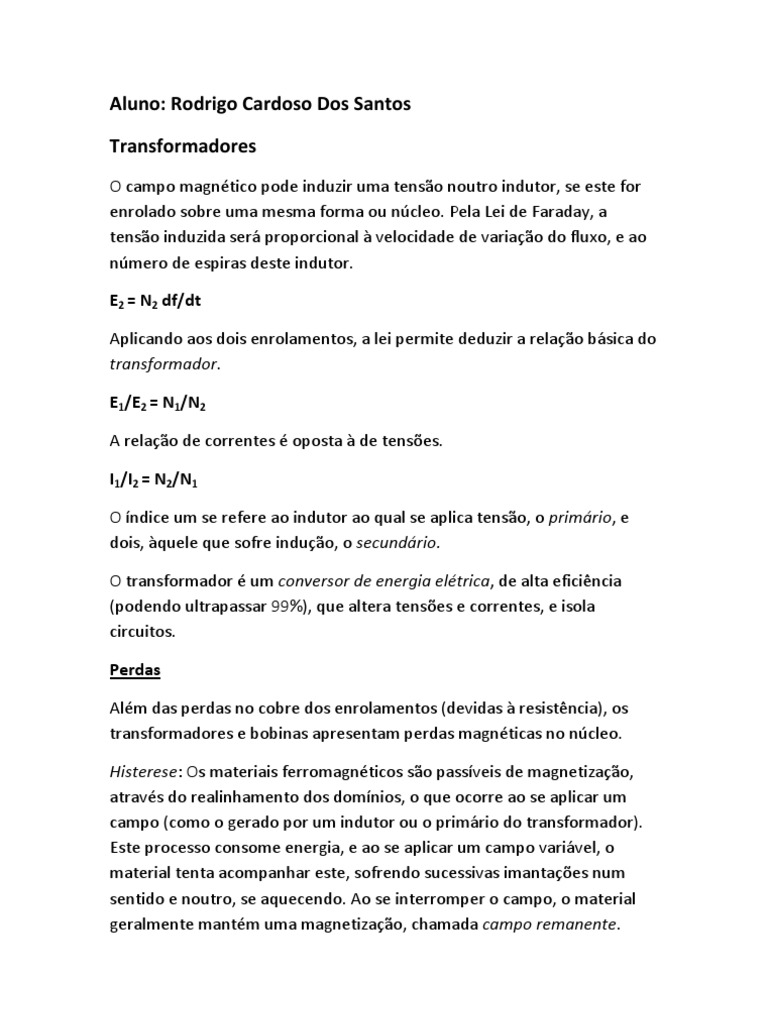 O campo magntico pode induzir uma tenso noutro indutor, se este for enrolado sobre uma mesma forma ou ncleo. Pela Lei de Faraday, a tenso induzida ser proporcional velocidade de variao do fluxo, e ao nmero de espiras deste indutor. E2 = N2 df/dt Aplicando aos dois enrolamentos, a lei permite deduzir a relao bsica do transformador. E1/E2 = N1/N2 A relao de correntes oposta de tenses. I1/I2 = N2/N1 O ndice um se refere ao indutor ao qual se aplica tenso, o primrio, e dois, quele que sofre induo, o secundrio. O transformador um conversor de energia eltrica, de alta eficincia (podendo ultrapassar 99%), que altera tenses e correntes, e isola circuitos. Perdas Alm das perdas no cobre dos enrolamentos (devidas resistncia), os transformadores e bobinas apresentam perdas magnticas no ncleo. Histerese: Os materiais ferromagnticos so passveis de magnetizao, atravs do realinhamento dos domnios, o que ocorre ao se aplicar um campo (como o gerado por um indutor ou o primrio do transformador). Este processo consome energia, e ao se aplicar um campo varivel, o material tenta acompanhar este, sofrendo sucessivas imantaes num sentido e noutro, se aquecendo. Ao se interromper o campo, o material geralmente mantm uma magnetizao, chamada campo remanente.