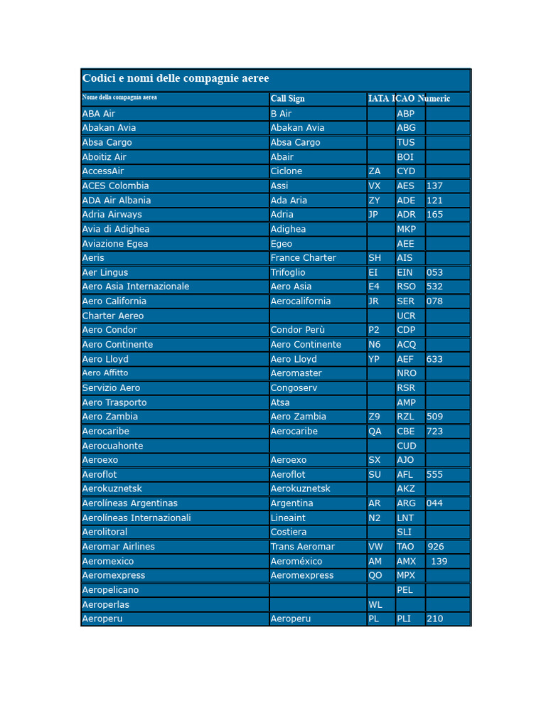 Codici e nomi delle compagnie aeree