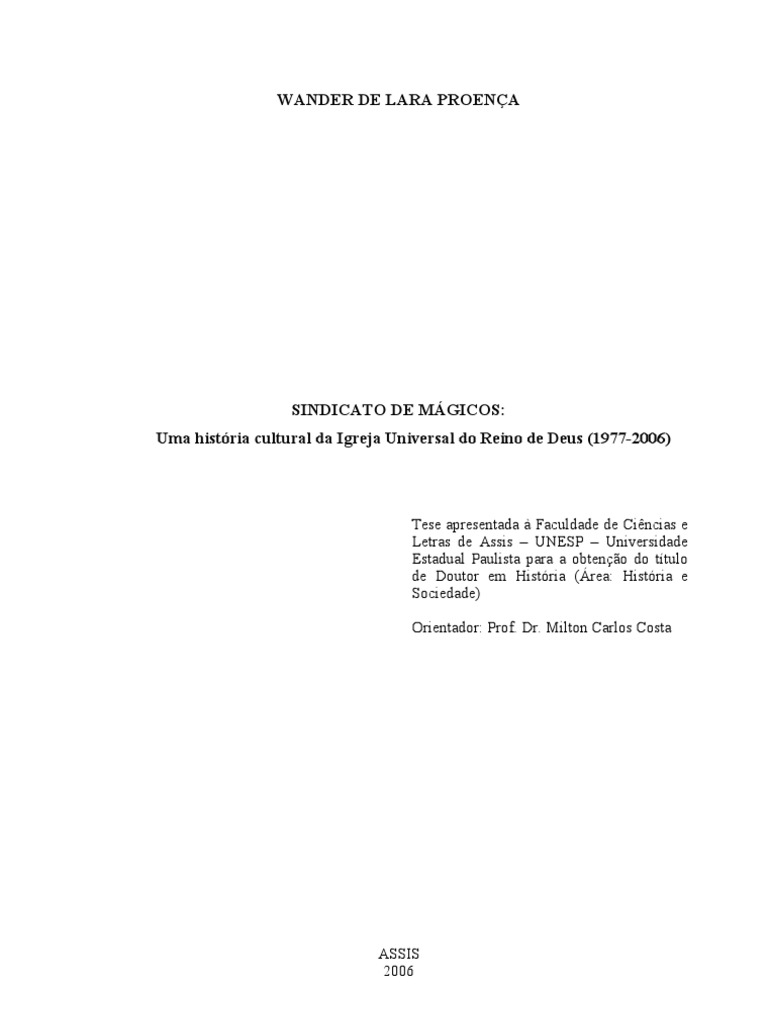 PROENÇA, Wander de Lara. Sindicato de Mágicos: uma história cultural da Igreja Universal do Reino de Deus (1977-2006). Assis: Unesp, 2006. 356 fl. Tese (Doutorado em História Social) – Faculdade de Ciências e Letras, Campus de Assis, da Universidade Estadual Paulista “Júlio de Mesquita Filho”, 2006.