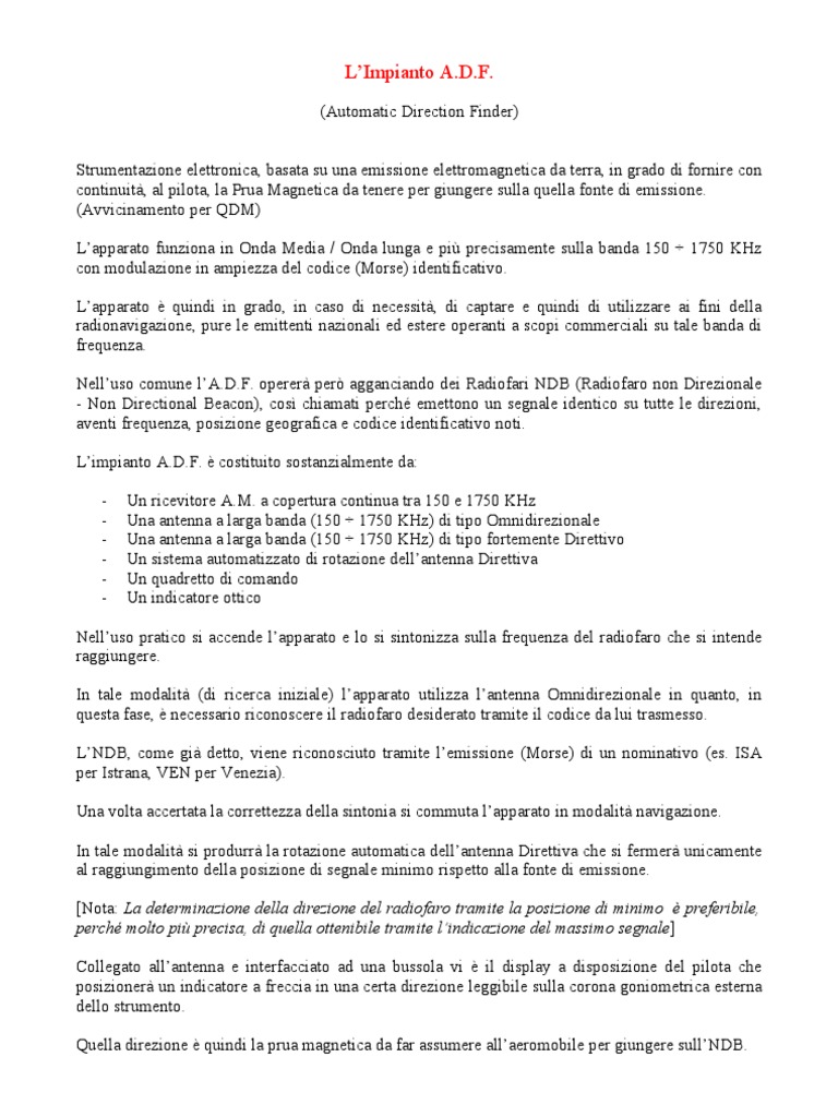 (Automatic Direction Finder) Strumentazione elettronica, basata su una emissione elettromagnetica da terra, in grado di fornire con continuit, al pilota, la Prua Magnetica da tenere per giungere sulla quella fonte di emissione. (Avvicinamento per QDM) Lapparato funziona in Onda Media / Onda lunga e pi precisamente sulla banda 150 1750 KHz con modulazione in ampiezza del codice (Morse) identificativo. Lapparato quindi in grado, in caso di necessit, di captare e quindi di utilizzare ai fini della radionavigazione, pure le emittenti nazionali ed estere operanti a scopi commerciali su tale banda di frequenza. Nelluso comune lA.D.F. operer per agganciando dei Radiofari NDB (Radiofaro non Direzionale - Non Directional Beacon), cos chiamati perch emettono un segnale identico su tutte le direzioni, aventi frequenza, posizione geografica e codice identificativo noti. Limpianto A.D.F. costituito sostanzialmente da: Un ricevitore A.M. a copertura continua tra 150 e 1750 KHz Una antenna a larga banda (150 1750 KHz) di tipo Omnidirezionale Una antenna a larga banda (150 1750 KHz) di tipo fortemente Direttivo Un sistema automatizzato di rotazione dellantenna Direttiva Un quadretto di comando Un indicatore ottico