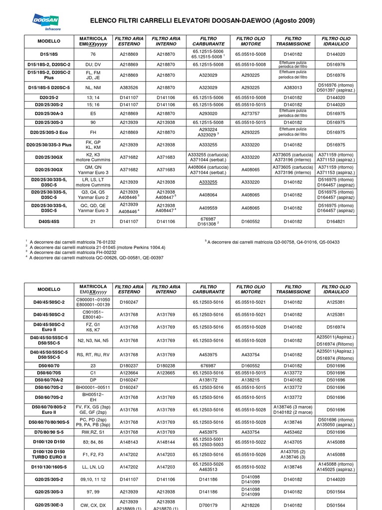 ELENCO FILTRI CARRELLI ELEVATORI DOOSAN-DAEWOO (Agosto 2009)