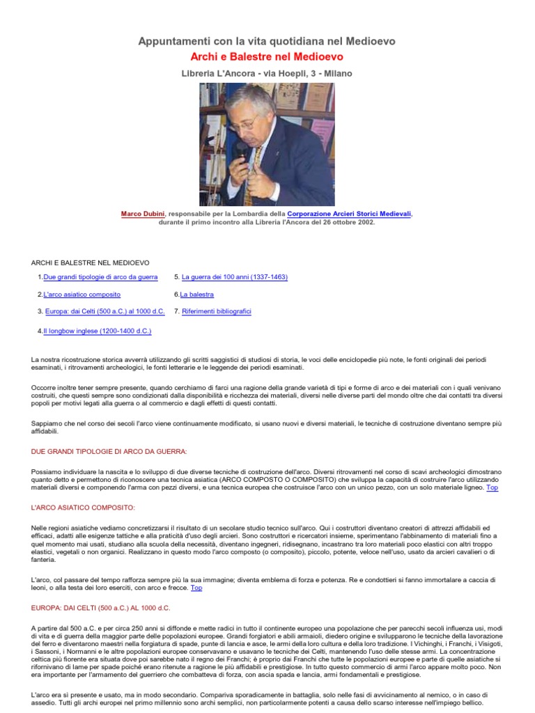 11) Contamine C.: La guerra nel medioevo -Il Mulino - Bologna - 1986 12) Cuomo Franco: Gli ordini cavallereschi - Newton Compton Editori S.r.l. - Roma - 1992 13) Hansard G.A.: The Book of Archery - Henry Bohn - York Str. Covent Garden - London - 1845 14) Hardy Robert: Storia civile e militare dei lunghi archi - Palutan Editrice - Varese - 1994 15) Keegan John: La grande storia della guerra - A. Mondadori - Milano - 1994 16) McEwen Edward, Miller L. Robert e Bergman A. Christopher: Evoluzione dell'arco e delle frecce nella storia in "LE SCIENZE" - Le Scienze S.p.A. - n. 276 - agosto 1991 17) Norton-Taylor Ducan: I Celti - Milano - 1980 18) Norwich John Julius: I Normanni nel sud 1016-1130 - Gruppo Ugo Mursia Editore S.p.A. - Milano 1971 19) Norwich John Julius: Il regno nel sole - I Normanni nel sud 1130-1194 - Gruppo U. Mursia Editore MI - 1972 20) Oman Charles: History of the Art of War in The Middle Age - Methuen & Co Ltd - London - 1898 21) Payne-Galwey, Ralph: The Crossbow, mediaeval and modern, military and sporting - The Holland Press - London 1958 22) Porteher Rudolf: L'epopea dei Vichinghi - Milano - 1972 Top Marco Dubini