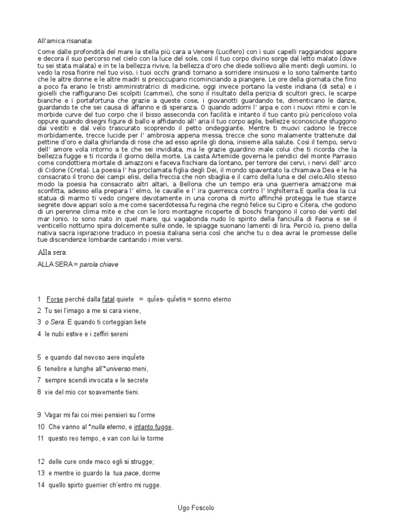 1 Forse perch dalla fatal quiete = ques- quetis = sonno eterno 2 Tu sei limago a me si cara viene, 3 o Sera. E quando ti corteggian liete 4 le nubi estive e i zeffiri sereni 5 e quando dal nevoso aere inquete 6 tenebre e lunghe all*universo meni, 7 sempre scendi invocata e le secrete 8 vie del mio cor soavemente tieni. 9 Vagar mi fai coi miei pensieri su lorme 10 Che vanno al *nulla eterno, e intanto fugge, 11 questo reo tempo, e van con lui le torme 12 delle cure onde meco egli si strugge; 13 e mentre io guardo la tua pace, dorme 14 quello spirto guerrier chentro mi rugge. Ugo Foscolo