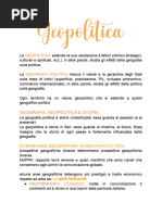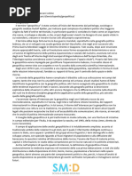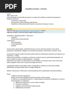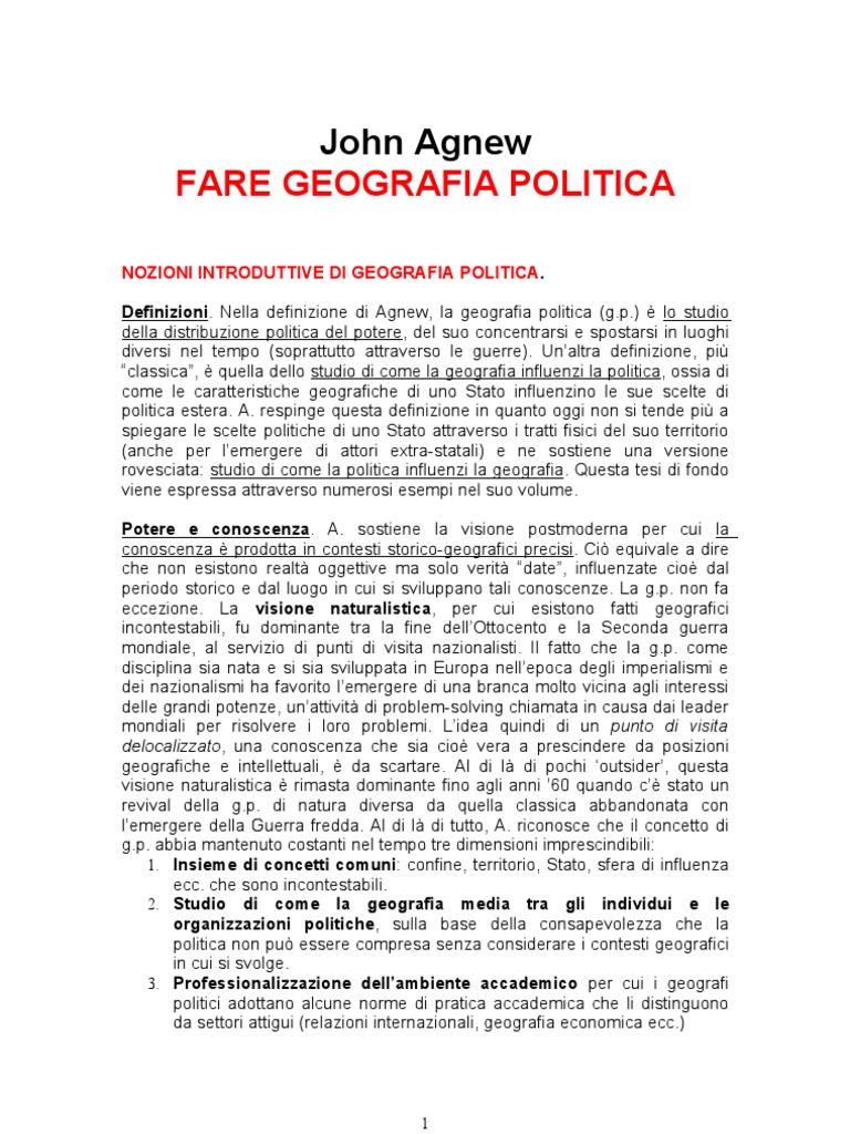 NOZIONI INTRODUTTIVE DI GEOGRAFIA POLITICA. Definizioni. Nella definizione di Agnew, la geografia politica (g.p.) lo studio della distribuzione politica del potere, del suo concentrarsi e spostarsi in luoghi diversi nel tempo (soprattutto attraverso le guerre). Unaltra definizione, pi classica, quella dello studio di come la geografia influenzi la politica, ossia di come le caratteristiche geografiche di uno Stato influenzino le sue scelte di politica estera. A. respinge questa definizione in quanto oggi non si tende pi a spiegare le scelte politiche di uno Stato attraverso i tratti fisici del suo territorio (anche per lemergere di attori extra-statali) e ne sostiene una versione rovesciata: studio di come la politica influenzi la geografia. Questa tesi di fondo viene espressa attraverso numerosi esempi nel suo volume. Potere e conoscenza. A. sostiene la visione postmoderna per cui la conoscenza prodotta in contesti storico-geografici precisi. Ci equivale a dire che non esistono realt oggettive ma solo verit date, influenzate cio dal periodo storico e dal luogo in cui si sviluppano tali conoscenze. La g.p. non fa eccezione. La visione naturalistica, per cui esistono fatti geografici incontestabili, fu dominante tra la fine dellOttocento e la Seconda guerra mondiale, al servizio di punti di visita nazionalisti. Il fatto che la g.p. come disciplina sia nata e si sia sviluppata in Europa nellepoca degli imperialismi e dei nazionalismi ha favorito lemergere di una branca molto vicina agli interessi delle grandi potenze, unattivit di problem-solving chiamata in causa dai leader mondiali per risolvere i loro problemi. Lidea quindi di un punto di visita delocalizzato, una conoscenza che sia cio vera a prescindere da posizioni geografiche e intellettuali, da scartare. Al di l di pochi outsider, questa visione naturalistica rimasta dominante fino agli anni 60 quando c stato un revival della g.p. di natura diversa da quella classica abbandonata con lemergere della Guerra fredda. Al di l di tutto, A. riconosce che il concetto di g.p. abbia mantenuto costanti nel tempo tre dimensioni imprescindibili: 1. Insieme di concetti comuni: confine, territorio, Stato, sfera di influenza ecc. che sono incontestabili. 2. Studio di come la geografia media tra gli individui e le organizzazioni politiche, sulla base della consapevolezza che la politica non pu essere compresa senza considerare i contesti geografici in cui si svolge. 3. Professionalizzazione dellambiente accademico per cui i geografi politici adottano alcune norme di pratica accademica che li distinguono da settori attigui (relazioni internazionali, geografia economica ecc.)