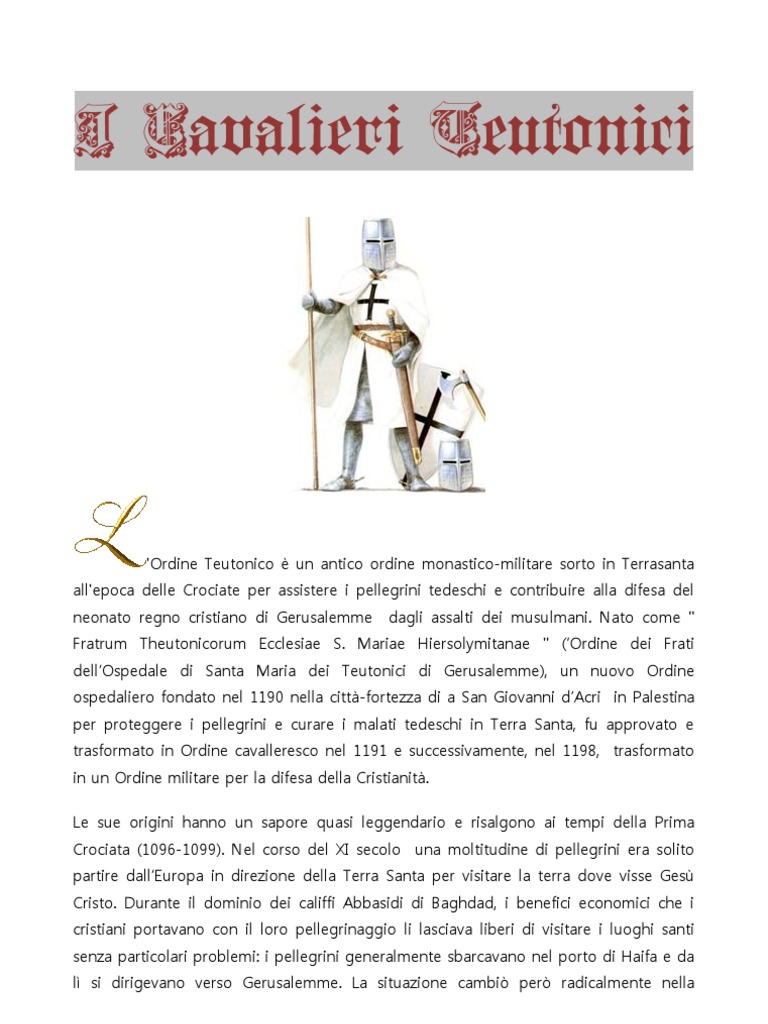 'Ordine Teutonico un antico ordine monastico-militare sorto in Terrasanta all'epoca delle Crociate per assistere i pellegrini tedeschi e contribuire