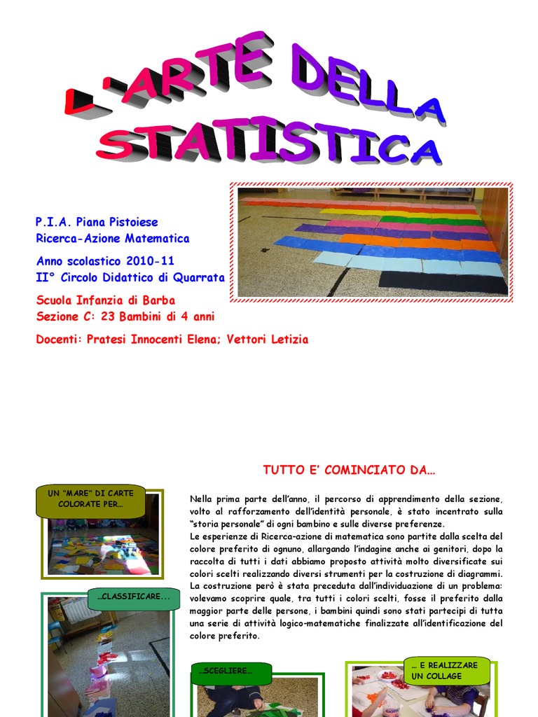 Nella prima parte dellanno, il percorso di apprendimento della sezione, volto al rafforzamento dellidentit personale, stato incentrato sulla storia personale di ogni bambino e sulle diverse preferenze. Le esperienze di Ricerca-azione di matematica sono partite dalla scelta del colore preferito di ognuno, allargando lindagine anche ai genitori, dopo la raccolta di tutti i dati abbiamo proposto attivit molto diversificate sui colori scelti realizzando diversi strumenti per la costruzione di diagrammi. La costruzione per stata preceduta dallindividuazione di un problema: volevamo scoprire quale, tra tutti i colori scelti, fosse il preferito dalla maggior parte delle persone, i bambini quindi sono stati partecipi di tutta una serie di attivit logico-matematiche finalizzate allidentificazione del colore preferito.