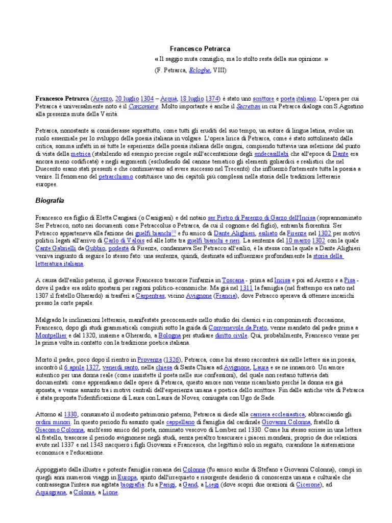 Francesco Petrarca (Arezzo, 20 luglio 1304 Arqu, 18 luglio 1374) stato uno scrittore e poeta italiano. L'opera per cui Petrarca universalmente noto il Canzoniere. Molto importante anche il Secretum in cui Petrarca dialoga con [Link] alla presenza muta della Verit. Petrarca, nonostante si considerasse soprattutto, come tutti gli eruditi del suo tempo, un autore di lingua latina, svolse un ruolo essenziale per lo sviluppo della poesia italiana in volgare. L'opera lirica di Petrarca, come stato sottolineato dalla critica, somma infatti in s tutte le esperienze della poesia italiana delle origini, compiendo tuttavia una selezione dal punto di vista della metrica (stabilendo ad esempio precise regole sull'accentazione degli endecasillabi che all'epoca di Dante era ancora meno codificata) e negli argomenti (escludendo dal canone tematico gli elementi goliardici e realistici che nel Duecento erano stati presenti e che continuavano ad avere successo nel Trecento) che influenz fortemente tutta la poesia a venire. Il fenomeno del petrarchismo costituisce uno dei capitoli pi complessi nella storia delle tradizioni letterarie europee. Biografia Francesco era figlio di Eletta Cangiani (o Canigiani) e del notaio ser Pietro di Parenzo di Garzo dell'Incisa (soprannominato Ser Petracco, noto nei documenti come Petraccolus o Petrarca, da cui il cognome del figlio), entrambi fiorentini. Ser Petracco apparteneva alla fazione dei guelfi bianchi [1] e fu amico di Dante Alighieri, esiliato da Firenze nel 1302 per motivi politici legati all'arrivo di Carlo di Valois ed alle lotte tra guelfi bianchi e neri. La sentenza del 10 marzo 1302 con la quale Cante Gabrielli da Gubbio, podest di Firenze, condannava Ser Petracco all'esilio, la stessa con la quale a Dante Alighieri veniva ingiunto di seguire lo stesso fato: una sentenza, quindi, destinata ad influenzare profondamente la storia della letteratura italiana. A causa dell'esilio paterno, il giovane Francesco trascorse l'infanzia in Toscana - prima ad Incisa e poi ad Arezzo e a Pisa dove il padre era solito spostarsi per ragioni politico-economiche. Ma gi nel 1311 la famiglia (nel frattempo era nato nel 1307 il fratello Gherardo) si trasfer a Carpentras, vicino Avignone (Francia), dove Petracco sperava di ottenere incarichi presso la corte papale. Malgrado le inclinazioni letterarie, manifestate precocemente nello studio dei classici e in componimenti d'occasione, Francesco, dopo gli studi grammaticali compiuti sotto la guida di Convenevole da Prato, venne mandato dal padre prima a Montpellier e dal 1320, insieme a Gherardo, a Bologna per studiare diritto civile. Qui, probabilmente, Francesco venne per la prima volta in contatto con la tradizione poetica italiana. Morto il padre, poco dopo il rientro in Provenza (1326), Petrarca, come lui stesso racconter sia nelle lettere sia in poesia, incontr il 6 aprile 1327, venerd santo, nella chiesa di Santa Chiara ad Avignone, Laura e se ne innamor. Un amore autentico per una donna reale (come insistette il poeta nelle sue confessioni), del quale non restano tuttavia dati documentati: come apprendiamo dalle opere di Petrarca, questo amore non venne ricambiato perch la donna era gi sposata, e venne assunto tra i motivi centrali dell'esperienza umana e poetica dello scrittore. Fin dalle antiche vite di Petrarca stata proposta l'identificazione di Laura con Laura de Noves, coniugata con Ugo de Sade. Attorno al 1330, consumato il modesto patrimonio paterno, Petrarca si diede alla carriera ecclesiastica, abbracciando gli ordini minori. In questo periodo fu assunto quale cappellano di famiglia dal cardinale Giovanni Colonna, fratello di Giacomo Colonna, anch'esso amico del poeta, nominato vescovo di Lombez nel 1330. Come lui stesso scrisse in una lettera al fratello, trascorse il periodo avignonese negli studi, senza peraltro trascurare i piaceri mondani; proprio da due relazioni avute nel 1337 e nel 1343 nacquero i figli Giovanni e Francesca, che legittim solo in seguito, curandone la sistemazione economica e l'educazione. Appoggiato dalla illustre e potente famiglia romana dei Colonna (fu amico anche di Stefano e Giovanni Colonna), comp in quegli anni numerosi viaggi in Europa, spinto dall'irrequieto e risorgente desiderio di conoscenza umana e culturale che contrassegna l'intera sua agitata biografia: fu a Parigi, a Gand, a Liegi (dove scopr due orazioni di Cicerone), ad Aquisgrana, a Colonia, a Lione.