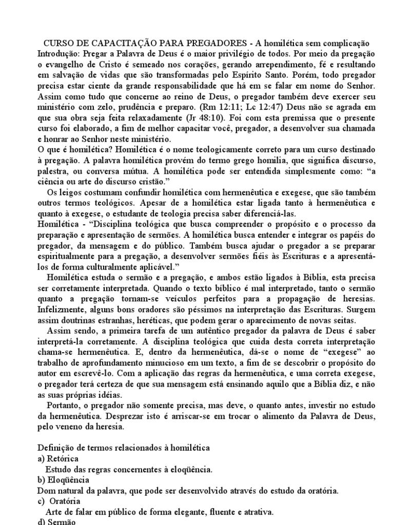 . Por meio da pregao o evangelho de Cristo semeado nos coraes, gerando arrependimento, f e resultando em salvao de vidas que so transformadas pelo Esprito Santo. Porm, todo pregador precisa estar ciente da grande responsabilidade que h em se falar em nome do Senhor. Assim como tudo que concerne ao reino de Deus, o pregador tambm deve exercer seu ministrio com zelo, prudncia e preparo. (Rm 12:11; Lc 12:47) Deus no se agrada em que sua obra seja feita relaxadamente (Jr 48:10). Foi com esta premissa que o presente curso foi elaborado, a fim de melhor capacitar voc, pregador, a desenvolver sua chamada e honrar ao Senhor neste ministrio. O que homiltica? Homiltica o nome teologicamente correto para um curso destinado pregao. A palavra homiltica provm do termo grego homilia, que significa discurso, palestra, ou conversa mtua. A homiltica pode ser entendida simplesmente como: a cincia ou arte do discurso cristo. Os leigos costumam confundir homiltica com hermenutica e exegese, que so tambm outros termos teolgicos. Apesar de a homiltica estar ligada tanto hermenutica e quanto exegese, o estudante de teologia precisa saber diferenci-las. Homiltica - Disciplina teolgica que busca compreender o propsito e o processo da preparao e apresentao de sermes. A homiltica busca entender e integrar os papis do pregador, da mensagem e do pblico. Tambm busca ajudar o pregador a se preparar espiritualmente para a pregao, a desenvolver sermes fiis s Escrituras e a apresentlos de forma culturalmente aplicvel. Homiltica estuda o sermo e a pregao, e ambos esto ligados Bblia, esta precisa ser corretamente interpretada. Quando o texto bblico mal interpretado, tanto o sermo quanto a pregao tornam-se veculos perfeitos para a propagao de heresias. Infelizmente, alguns bons oradores so pssimos na interpretao das Escrituras. Surgem assim doutrinas estranhas, herticas, que podem gerar o aparecimento de novas seitas. Assim sendo, a primeira tarefa de um autntico pregador da palavra de Deus saber interpret-la corretamente. A disciplina teolgica que cuida desta correta interpretao chama-se hermenutica. E, dentro da hermenutica, d-se o nome de exegese ao trabalho de aprofundamento minucioso em um texto, a fim de se descobrir o propsito do autor em escrev-lo. Com a aplicao das regras da hermenutica, e uma correta exegese, o pregador ter certeza de que sua mensagem est ensinando aquilo que a Bblia diz, e no as suas prprias idias. Portanto, o pregador no somente precisa, mas deve, o quanto antes, investir no estudo da hermenutica. Desprezar isto arriscar-se em trocar o alimento da Palavra de Deus, pelo veneno da heresia. Definio de termos relacionados homiltica a) Retrica Estudo das regras concernentes eloqncia. b) Eloqncia Dom natural da palavra, que pode ser desenvolvido atravs do estudo da oratria. c) Oratria Arte de falar em pblico de forma elegante, fluente e atrativa. d) Sermo