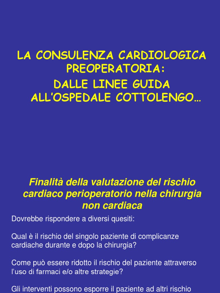 Dovrebbe rispondere a diversi quesiti: Qual il rischio del singolo paziente di complicanze cardiache durante e dopo la chirurgia?