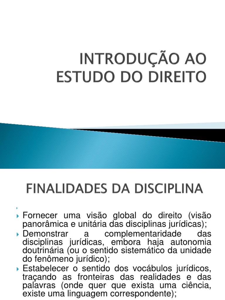 Existem vocbulos com sentido tcnico, como 'codicilo', que significa pequeno testamento. Existem tambm aqueles com sentido tcnico com grafia idntica a outro de uso corriqueiro. Ex: inveno; Localizar o direito no mundo da cultura, no universo do saber humano; A IED o elo entre a cultura geral e a jurdica; Fornecer as noes bsicas do mtodo jurdico.