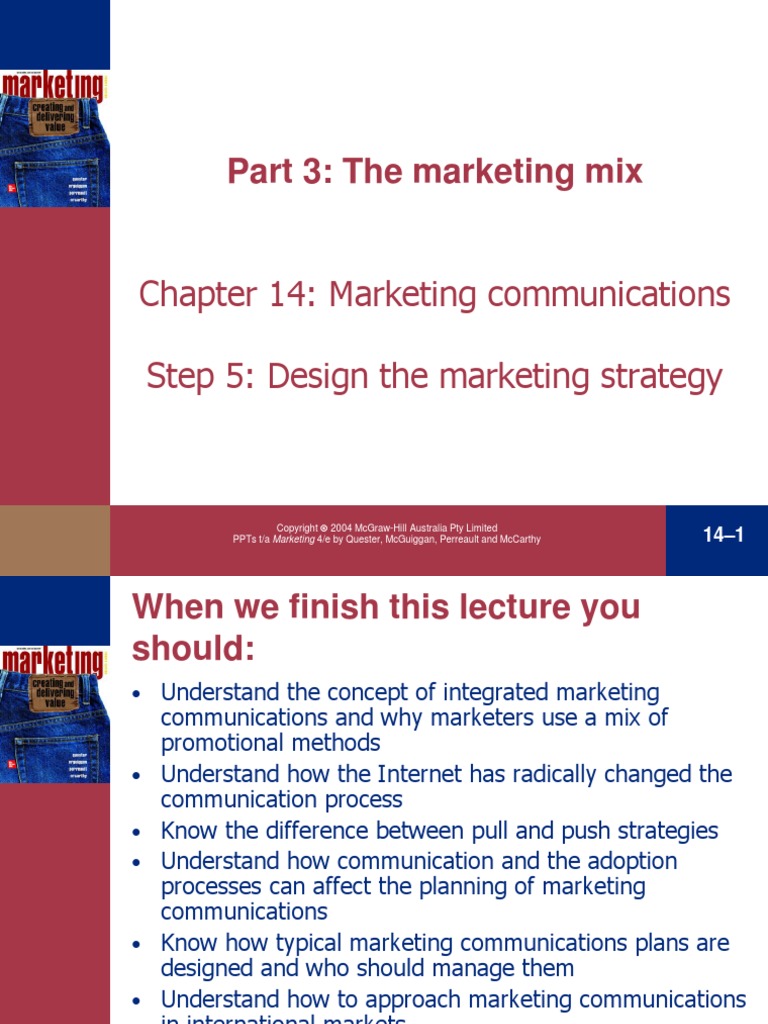 communications and why marketers use a mix of promotional methods Understand how the Internet has radically changed the communication process Know the difference between pull and push strategies Understand how communication and the adoption processes can affect the planning of marketing communications Know how typical marketing communications plans are designed and who should manage them Understand how to approach marketing communications in international markets Know what an advertising agency is and how it operates
