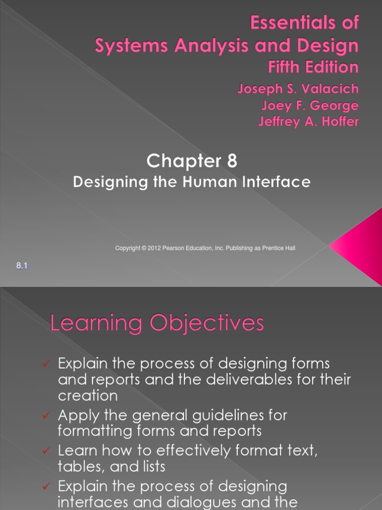 Explain the process of designing forms and reports and the deliverables for their creation Apply the general guidelines for formatting forms and reports Learn how to effectively format text, tables, and lists Explain the process of designing interfaces and dialogues and the deliverables for their creation