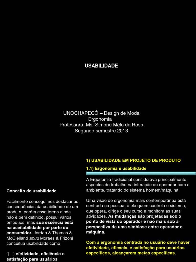 1) USABILIDADE EM PROJETO DE PRODUTO 1.1) Ergonomia e usabilidade A Ergonomia tradicional considerava principalmente aspectos do trabalho na interao do operador com o ambiente, tratando do sistema homem/mquina. Uma viso de ergonomia mais contempornea est centrada na pessoa, ela quem controla o sistema, que opera, dirige o seu curso e monitora as suas atividades. As mudanas so projetadas sob o ponto de vista do operador e no mais sob a perspectiva de uma simbiose entre operador e mquina. Com a ergonomia centrada no usurio deve haver efetividade, eficcia, e satisfao para usurios especficos, alcanarem metas especficas.
