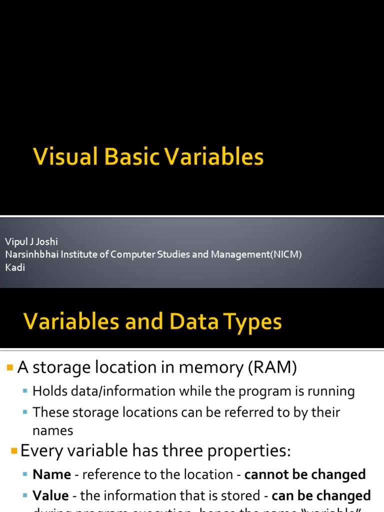 Integer variables: Long, Integer, Short, Byte Floating-point variables: Single, Double Fixed decimal point variable: Decimal Boolean variables: True, False Character variable: Char Text variable: String The Object variable