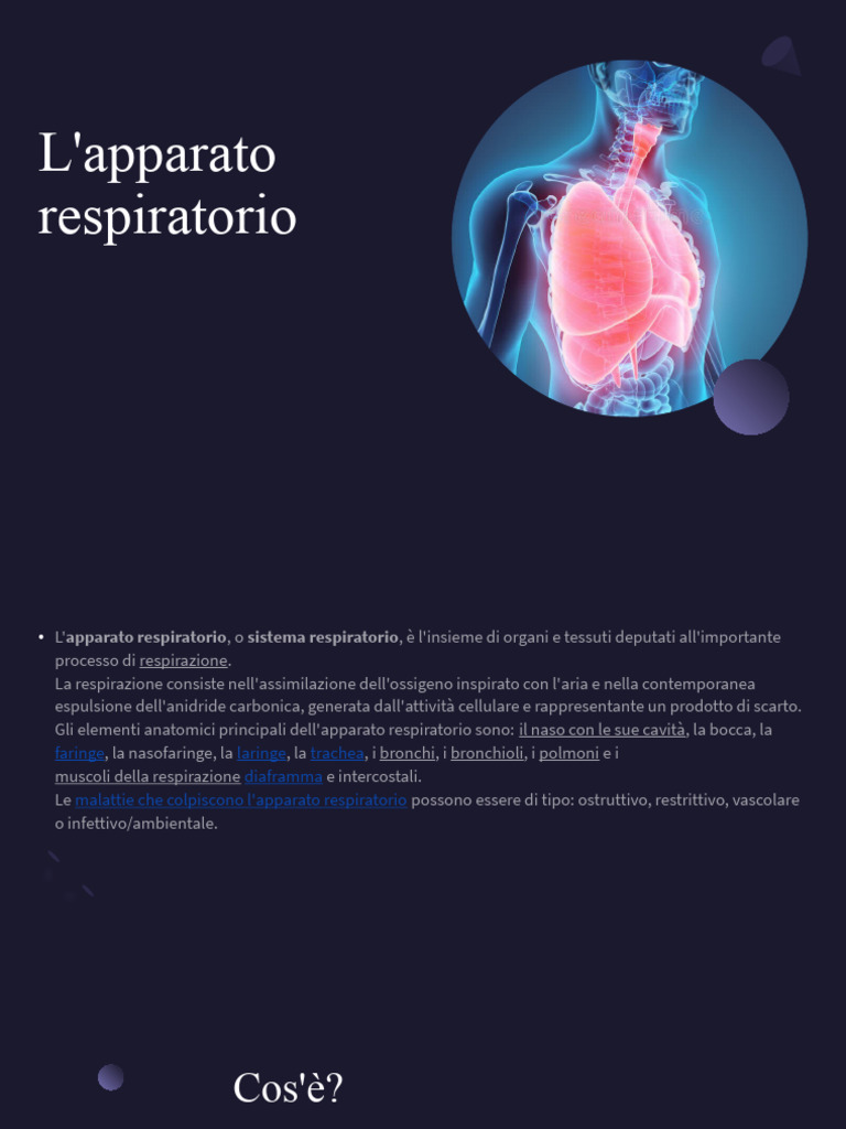 • L'apparato respiratorio, o sistema respiratorio, è l'insieme di organi e tessuti deputati all'importante