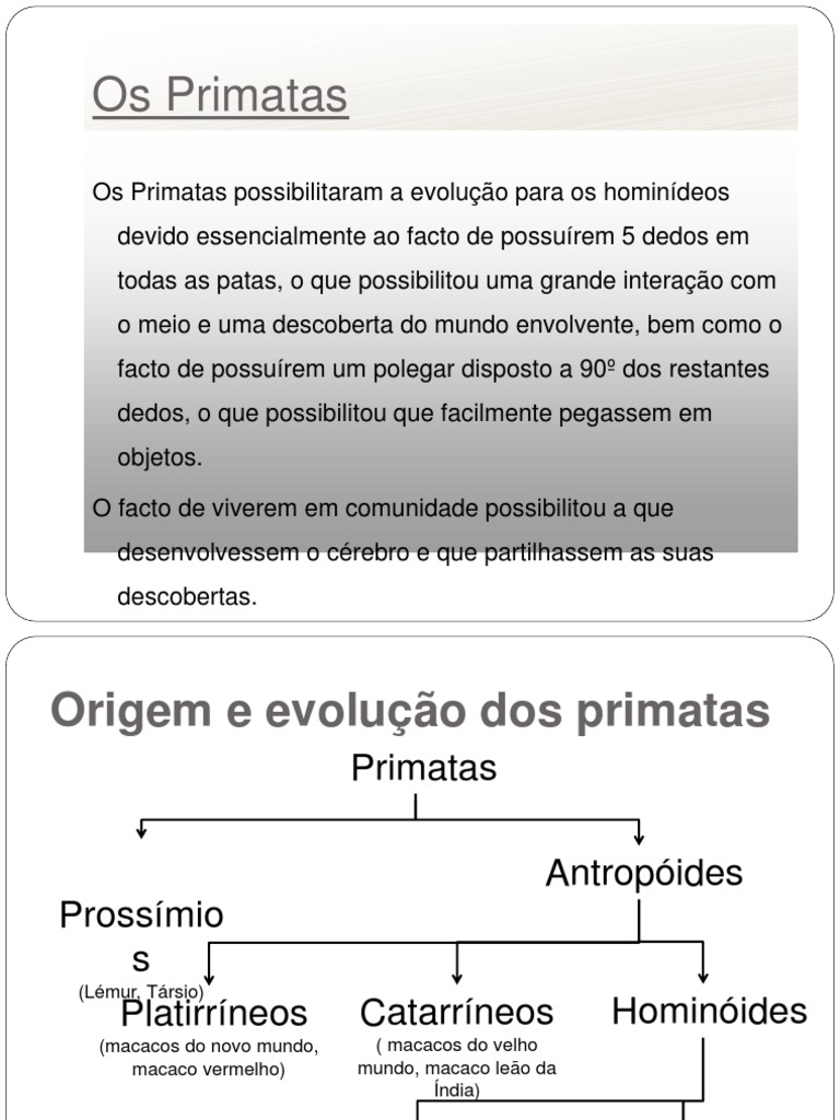 Os Primatas possibilitaram a evoluo para os homindeos devido essencialmente ao facto de possurem 5 dedos em todas as patas, o que possibilitou uma grande interao com o meio e uma descoberta do mundo envolvente, bem como o facto de possurem um polegar disposto a 90 dos restantes dedos, o que possibilitou que facilmente pegassem em objetos. O facto de viverem em comunidade possibilitou a que desenvolvessem o crebro e que partilhassem as suas descobertas.