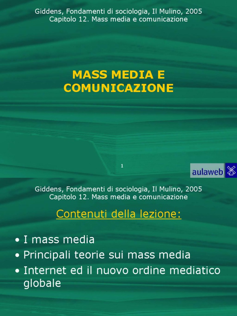 Giddens, Fondamenti di sociologia, Il Mulino, 2005 Capitolo 12. Mass media e comunicazione